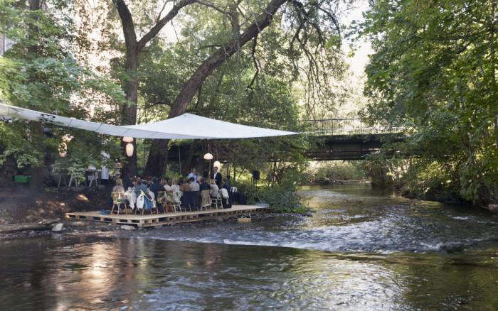The title is dramatic, but the concept is not imaginary. The now-famous floating dinner party in Oslo grew out of a real midsummer event staged on the Akerselva River. Guests gathered for a lamplit feast on floating pallets tethered to the riverbank. It was organized by Food Studio in collaboration with Maaemo and coffee roaster Tim Wendelboe, and it leaned hard into fresh seasonal ingredients, outdoor cooking, and an atmosphere that felt halfway between woodland theater and high-design supper club.