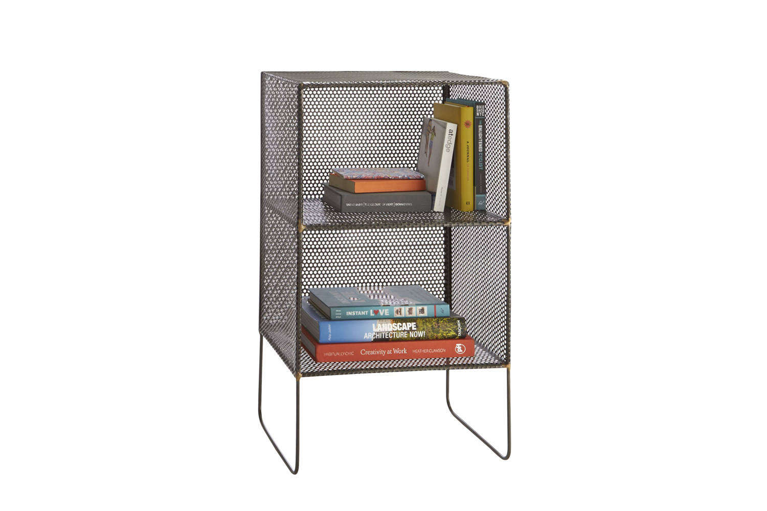 The signature of the Sift tower is its mesh. Instead of solid shelves, the cubbies use a fine metal grid that reads